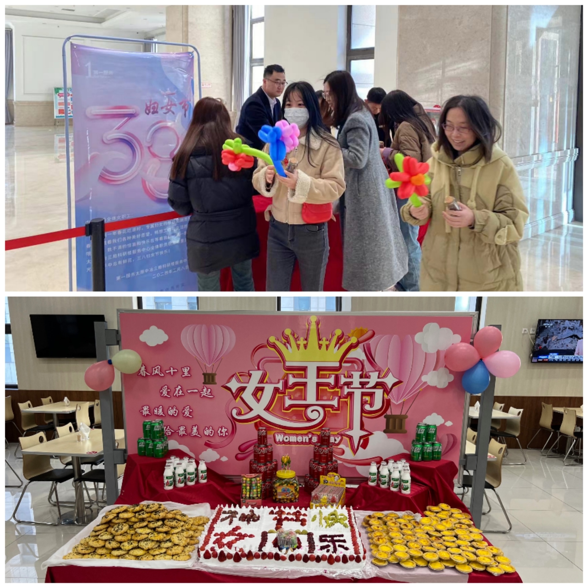 太原基地组织第一物业、江南餐饮公司在科研楼大厅、职工食堂为女职工发放玫瑰花、蛋糕、糖果,营造了浓郁温馨的节日氛围。